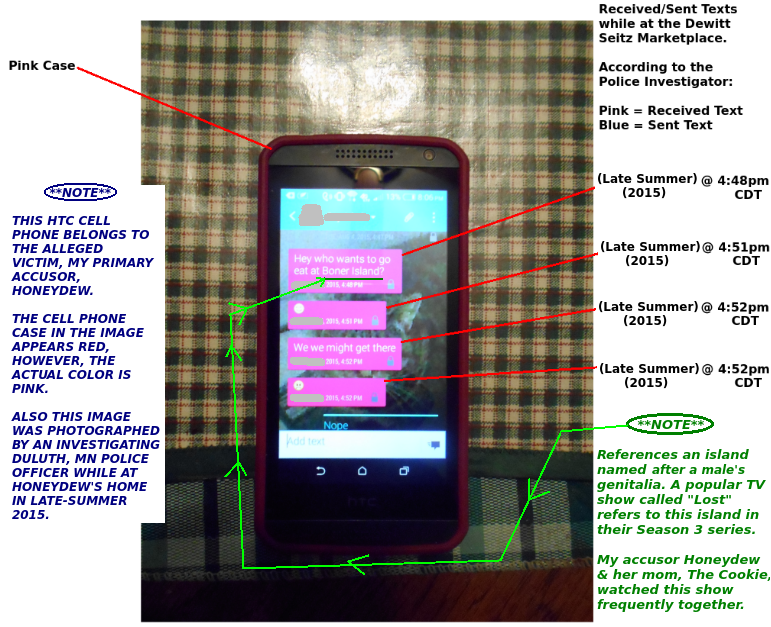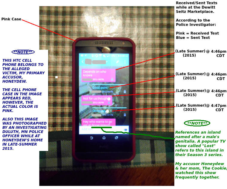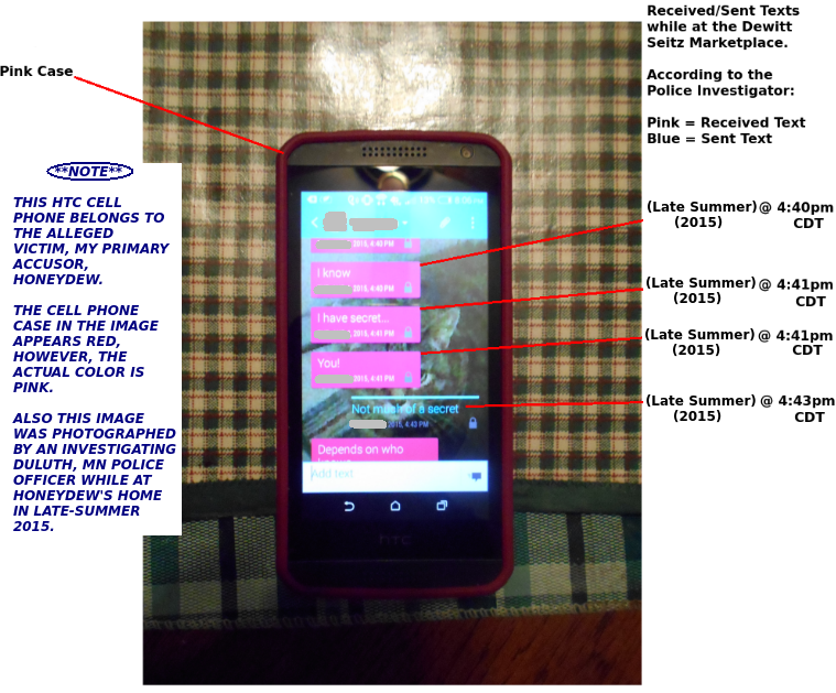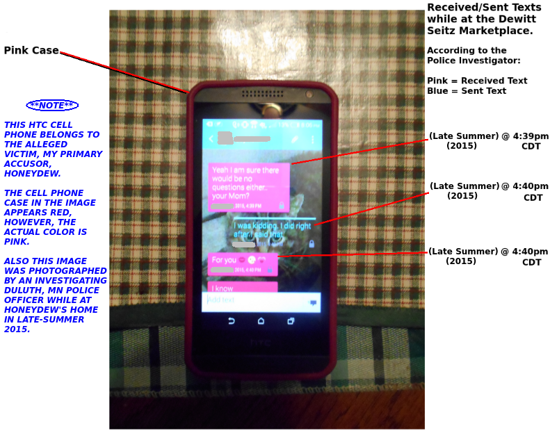 Below is the first set of sexting messages Honeydew claimed to the Duluth Police that she received on her cell phone from me while at the Dewitt Seitz Marketplace on that Early August 2015 Tuesday. They start at 4:39pm and end at 4:53pm. Additionally, these texts in the following images are not a typical conversation I would have with someone. *Plus, these also took place while I was still in the Market’s Public Men’s Room and my cell phone wasn’t with me at the time. Again, Cookie and Honeydew had my cell phone as noted above with The Blue Heron Trading Company receipt. *Importantly also, is that my cell phone had no password protection on it either. Thus, it wasn’t locked when they had it in their possession.