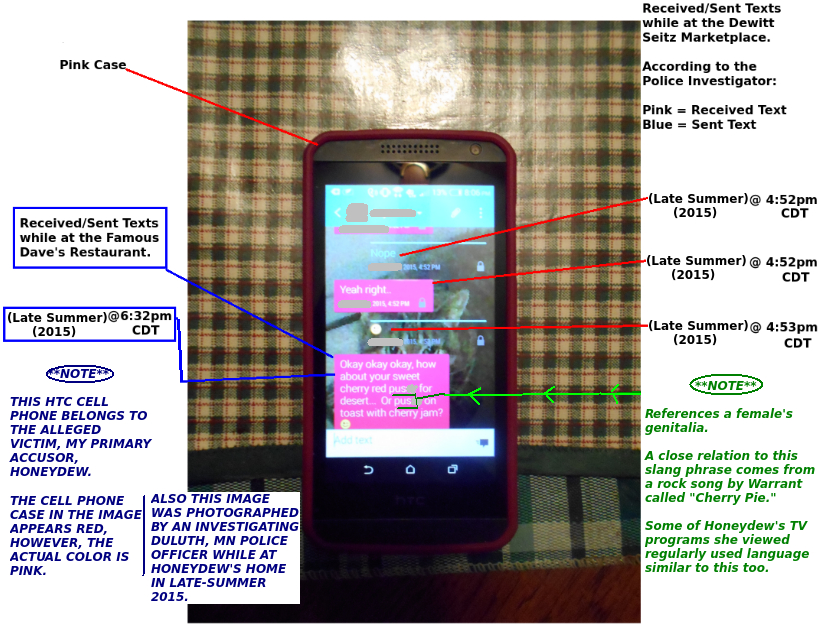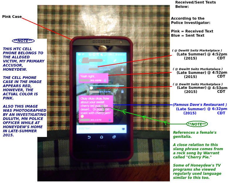 Below is the second set of sexting messages Honeydew claimed to the Duluth Police that she received on her phone from mine while at Famous Dave’s on an Early August 2015 Tuesday. Again, this isn’t a typical conversation I’d engage in. Once more, I point out that these texts took place while I was in the Public Men’s Room and I didn’t have my cell phone with me at the time either. And, my cell phone was still not password protected. *PLUS, I didn’t have any of these texts on my phone what-so-ever after I got it back from Honeydew’s holding it. Nor, did I ever see or hear of these texts until my home was raided and I was arrested by the Duluth Police in Late August 2015. So in Late August, is when I finally learned of them. Additionally, the police didn’t have these images on record from my cell after their raid of my home and my arrest either. For if they did, my first legal discovery from them would’ve shown it. As such this means Honeydew erased the messages she sent from my cell phone to hers before giving it back to me at both locations listed earlier. But, left them on her cell phone to legally frame me with later on. Her Mom was also with her during these times too.